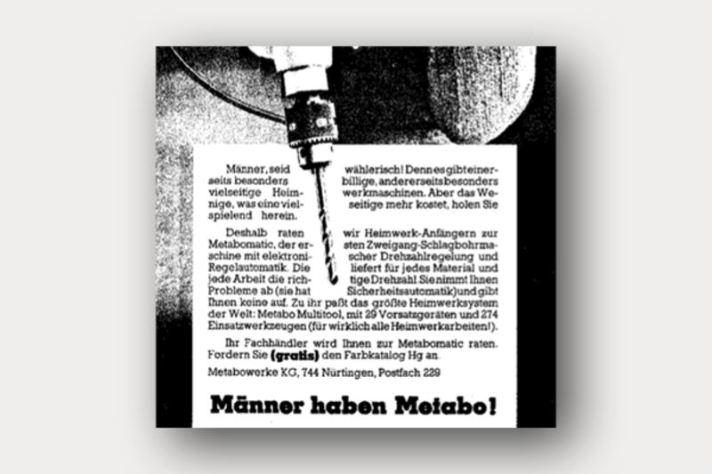 Lo spirito del tempo, tuttavia, cambia. Negli anni '80, Metabo percepisce chiaramente che le donne non gradiscono questo slogan – e che devono essere prese sul serio quali utilizzatrici di utensili. "Männer haben Metabo" viene messo da parte. Gli utensili Metabo sono sinonimo di qualità, potenza e sicurezza – per gli uomini e per le donne. Benvenuti alla Metabo, dove ogni persona può trovare gli utensili adatti alle proprie esigenze.